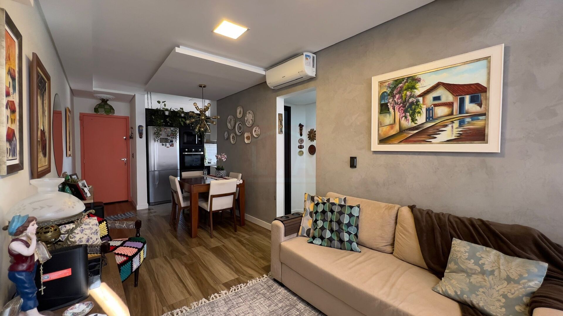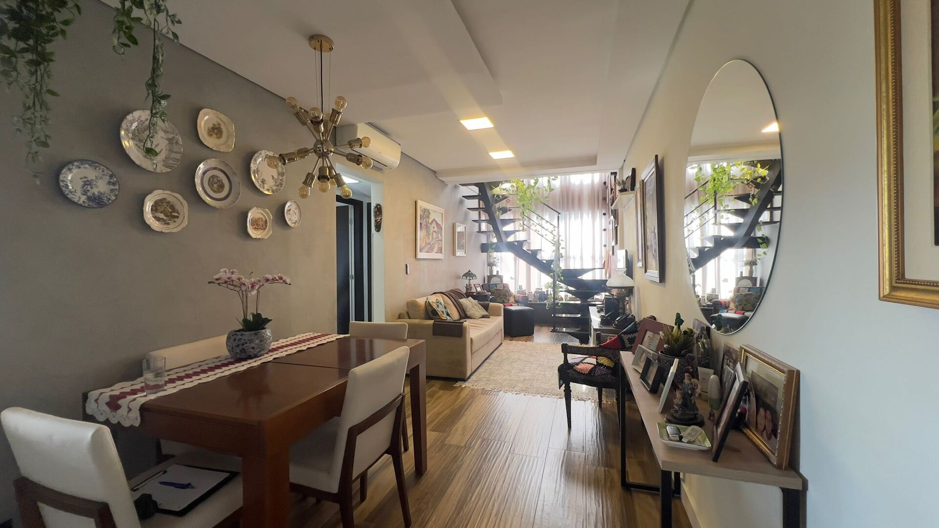 - Sala para dois ambientes é integrada e aconchegante, conectada à cozinha planejada moderna;